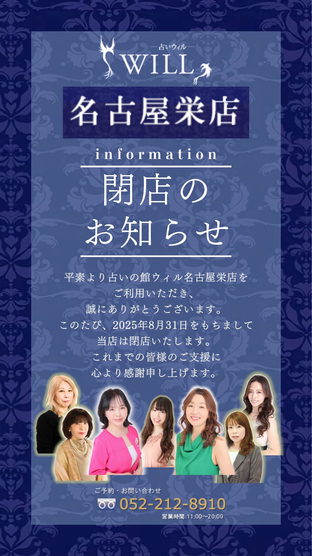 皆様のご来館占いの館ウィル名古屋栄店スタッフ・占い師一同心よりお待ちしております。